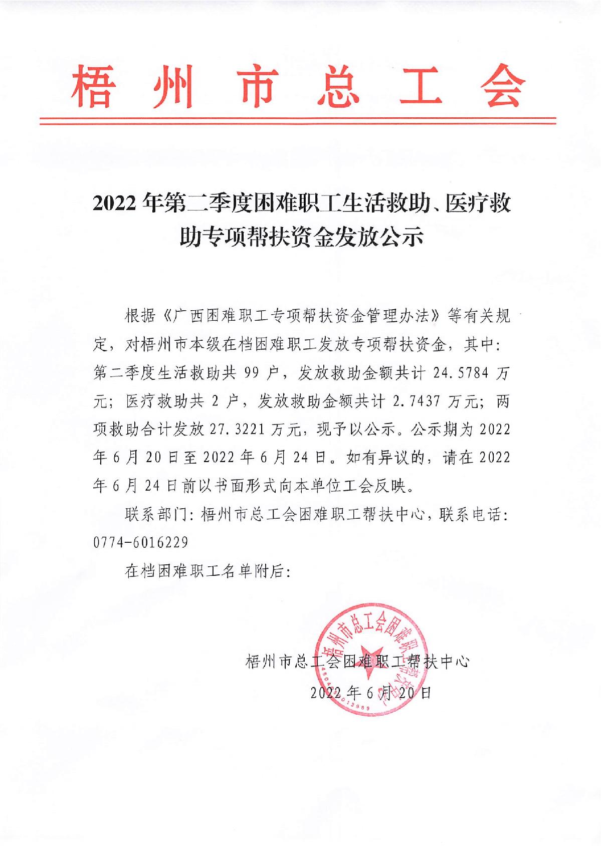 2022年第二季度困難職工生活救助、醫(yī)療救助專項幫扶資金發(fā)放公示