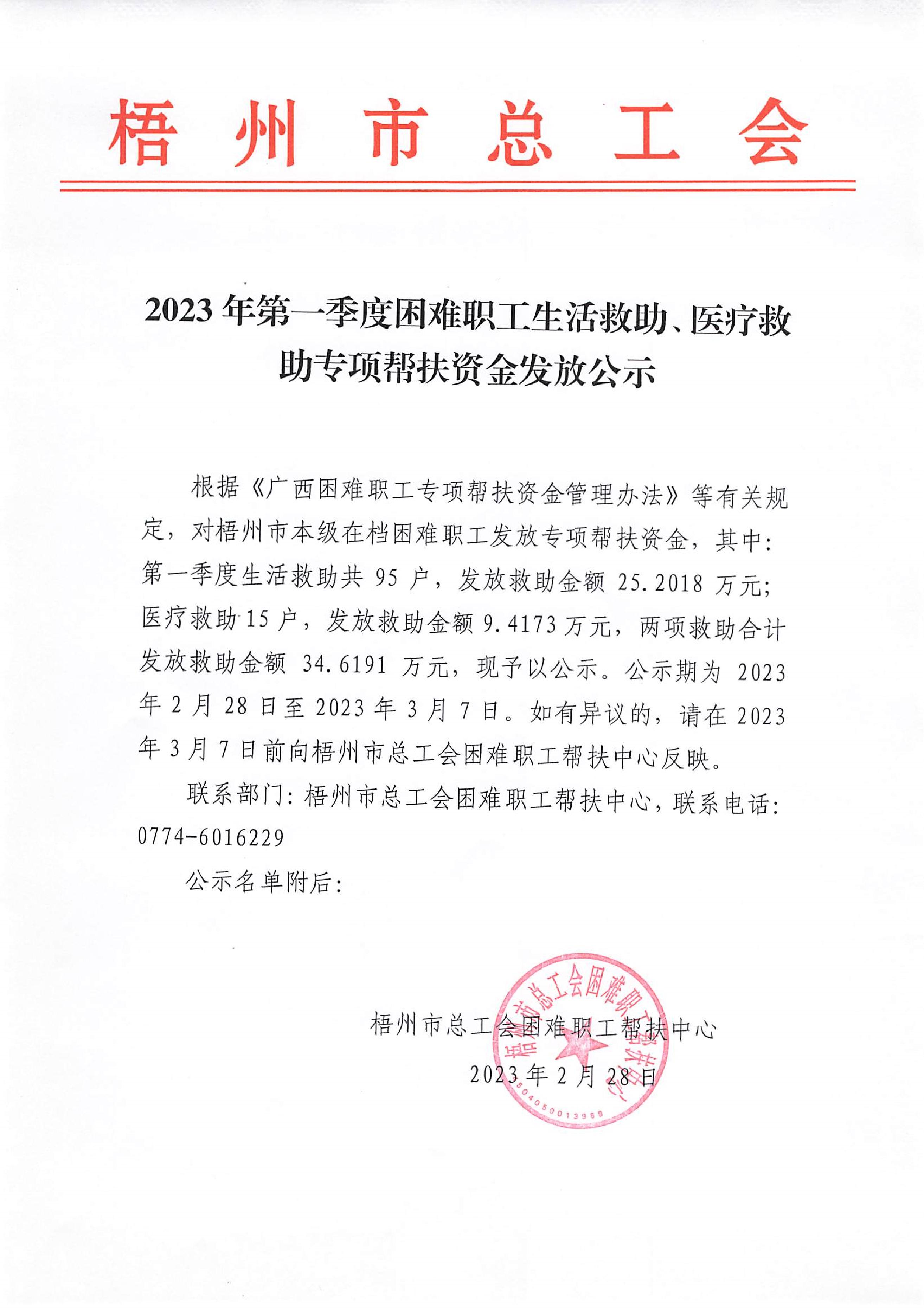 2023年第一季度困難職工生活救助、醫(yī)療救助專項幫扶資金發(fā)放公示