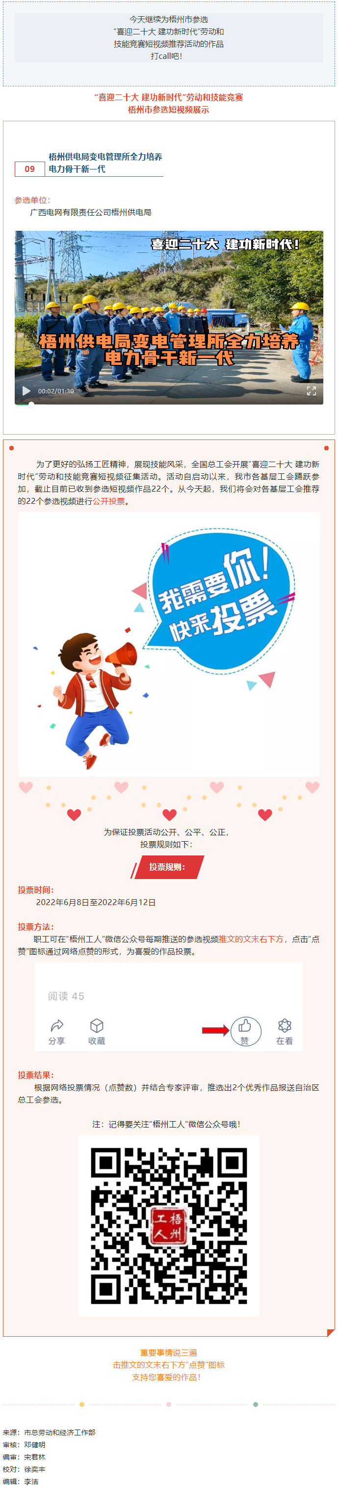 廣西電網(wǎng)有限責(zé)任公司梧州供電局參選作品(一)丨“喜迎二十大 建功新時(shí)代” 勞動(dòng)和技能競(jìng)賽短視頻投票活動(dòng)開始啦!
