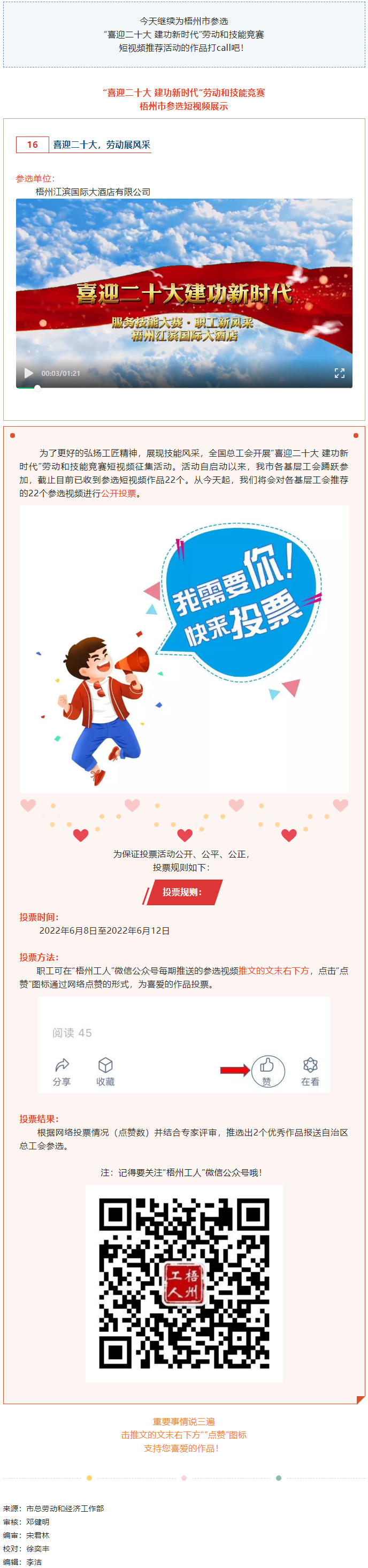 梧州江濱國際大酒店參選作品丨“喜迎二十大 建功新時代” 勞動和技能競賽短視頻投票活動開始啦!