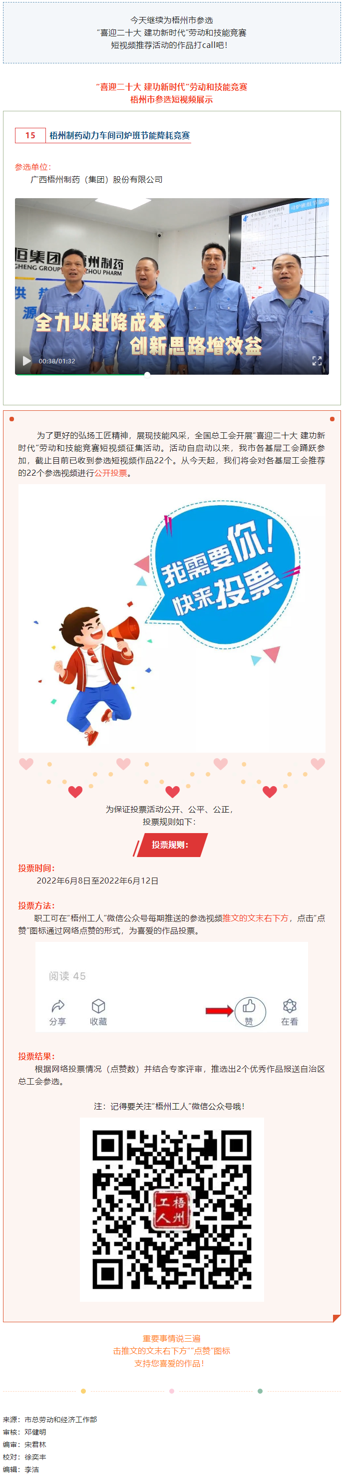 廣西梧州制藥(集團(tuán))股份有限公司參選作品丨“喜迎二十大 建功新時(shí)代” 勞動(dòng)和技能競(jìng)賽短視頻投票活動(dòng)開始啦!