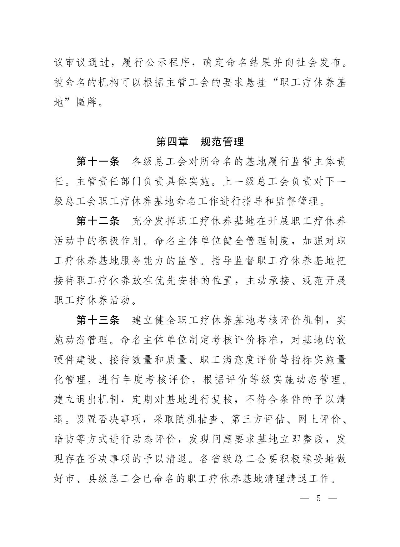 《辦法》要求,各省級(jí)總工會(huì)制定本轄區(qū)基地命名管理制度、工作規(guī)劃,履行制定制度、組織申報(bào)、基層推報(bào)、審核命名等命名程序。各級(jí)總工會(huì)對(duì)所命名的基地履行監(jiān)管主體責(zé)任,健全管理制度,加強(qiáng)指導(dǎo)監(jiān)督,定期監(jiān)督檢查。充分發(fā)揮基地在開展職工療休養(yǎng)活動(dòng)中的積極作用。建立考核評(píng)價(jià)機(jī)制、退出機(jī)制,制定考核評(píng)價(jià)標(biāo)準(zhǔn),設(shè)置否決事項(xiàng),實(shí)施動(dòng)態(tài)管理。