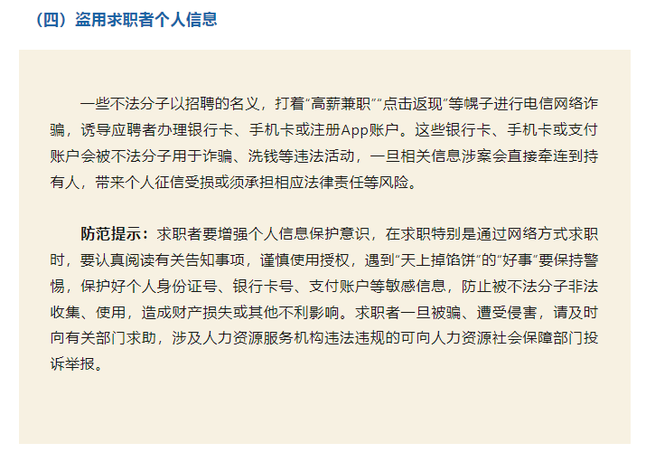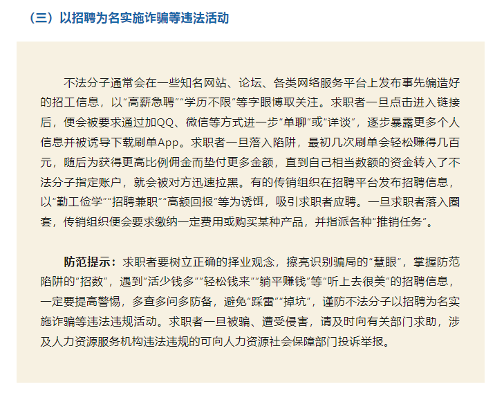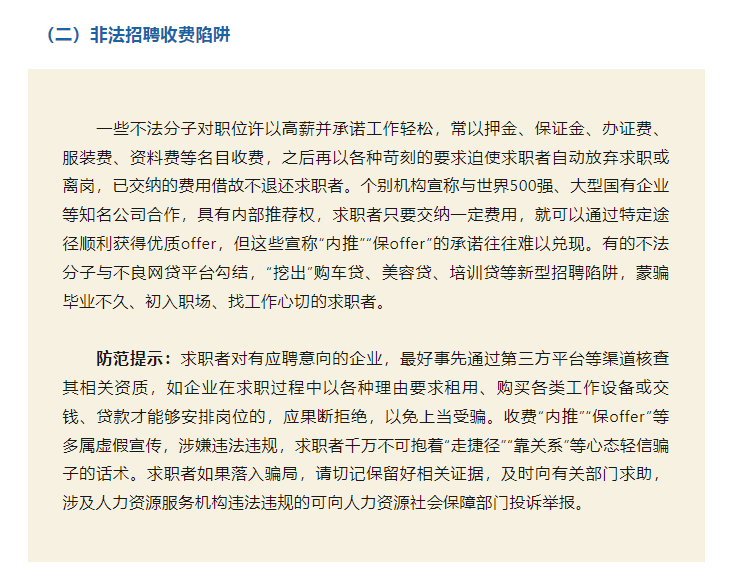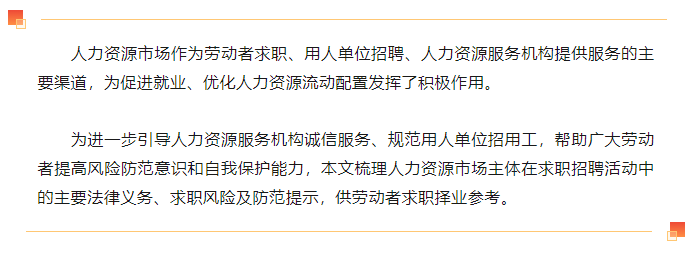 為進一步引導人力資源服務機構(gòu)誠信服務、規(guī)范用人單位招用工,幫助廣大勞動者提高風險防范意識和自我保護能力,本文梳理人力資源市場主體在求職招聘活動中的主要法律義務、求職風險及防范提示,供勞動者求職擇業(yè)參考。